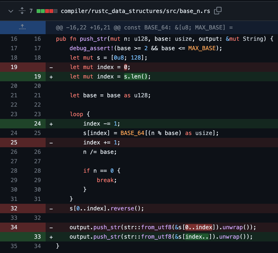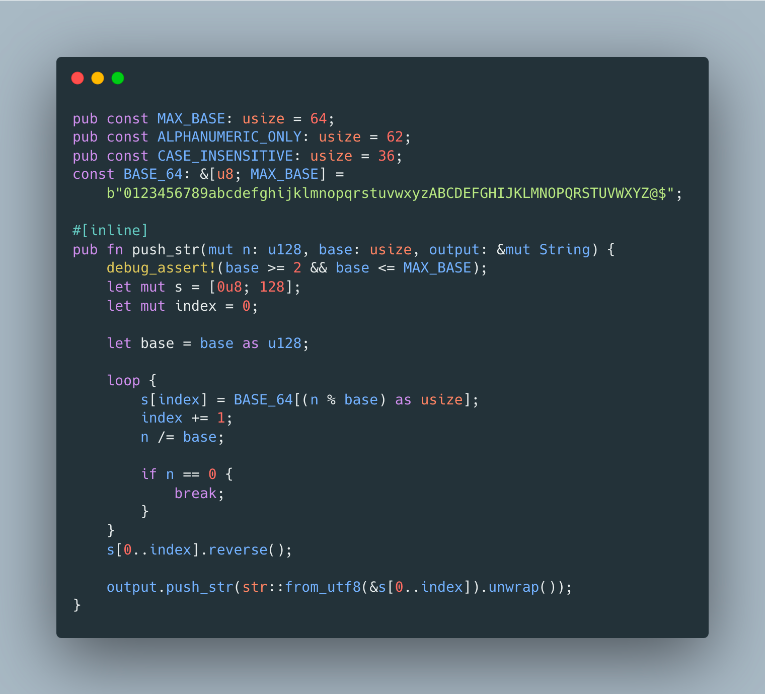 Rustc is the official compiler for the Rust programming language. It takes Rust source code as input and produces binary code, either as a library or executable. Rustc is written in Rust itself, and is designed to be fast, efficient, and safe. Having so many responsibilities, it’s no surprise that it has a number of reusable data structures and algorithms under the hood. Today we’re going to take a look at one of them - integer encoding for requested base.