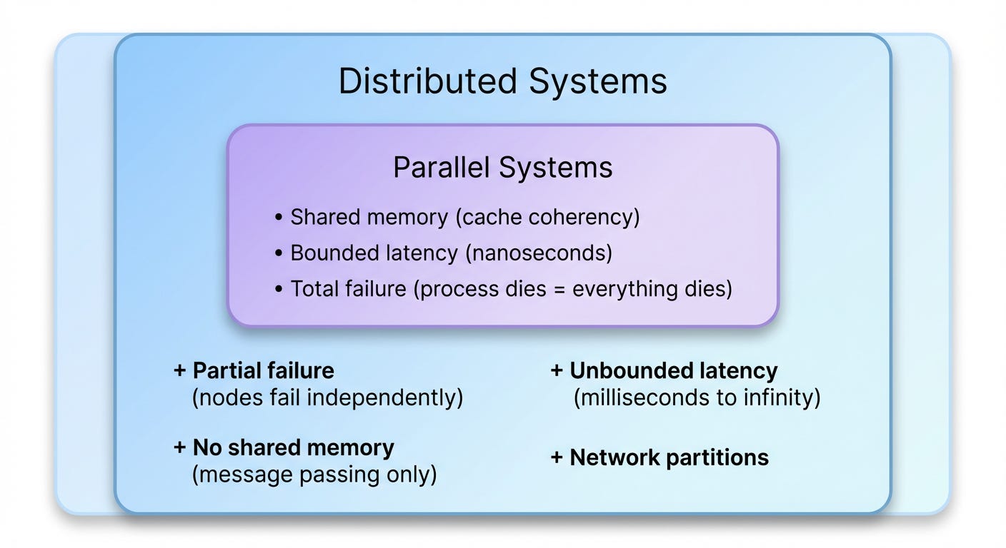 No shared memory: Parallel systems get cache coherency protocols (MESI) for free. Distributed systems must build replication and consistency from scratch.