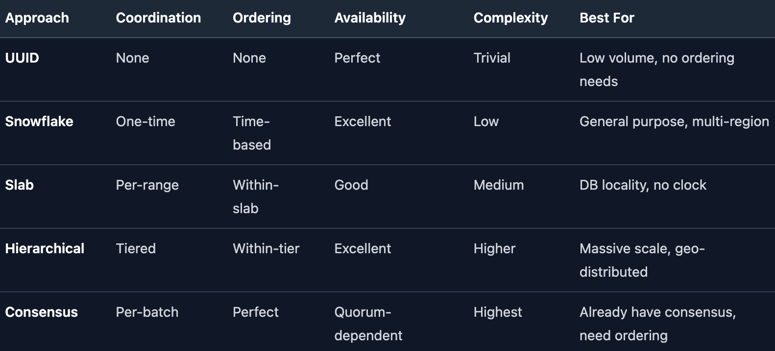 Database auto-increment gives you perfect ordering and minimal size, but requires a round-trip to a central database for every ID. It’s a throughput bottleneck and a single point of failure.