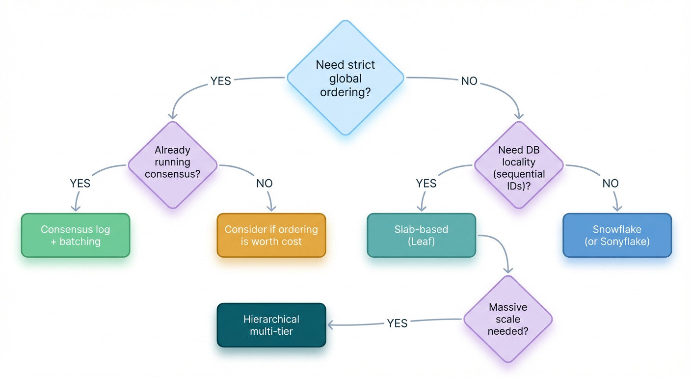 UUIDs offer zero coordination—any node generates 128 random bits independently. But they’re large, unsortable, and their randomness destroys B-tree locality. Every insert lands on a random leaf page.